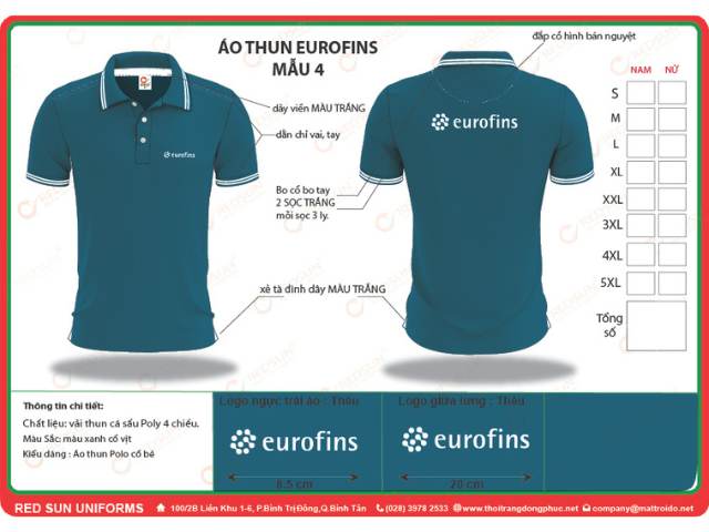 Áo được may theo thông số chuẩn RED SUN hoặc tùy chỉnh theo yêu cầu cụ thể của Eurofins, đảm bảo sự vừa vặn và thoải mái nhất cho từng nhân viên.